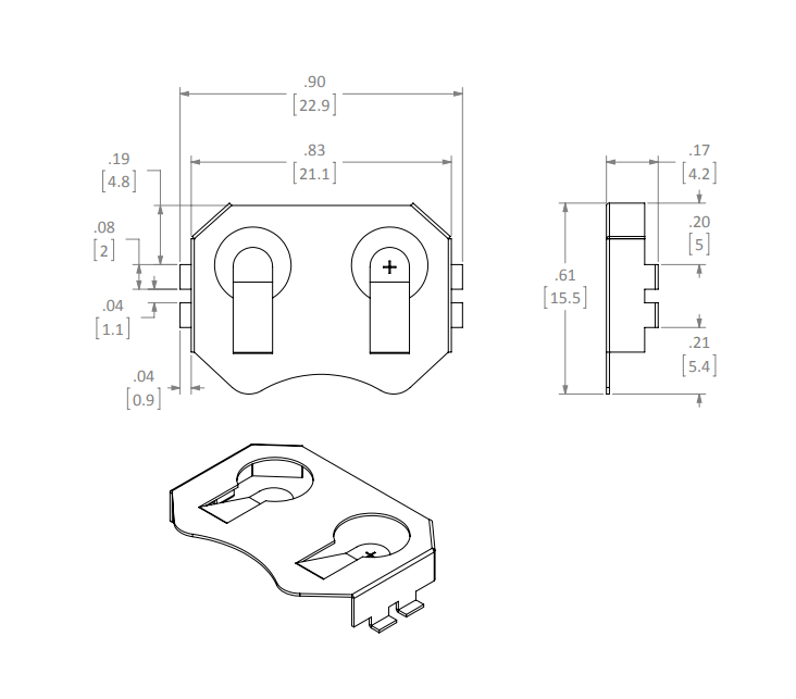 Podstawka baterii; 2032; BR2032; CR2032; ilość baterii: 1; średnica 20mm; długość: 32mm; szerokość: 16mm; wysokość: 5,4mm