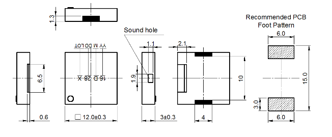 Abmessungen 12x12x3mm; Spannung: 1~25V; Eingangsspannung: 3V; Schallpegel: 75 dB; -40~105°C Frequenz 4000 Hz;