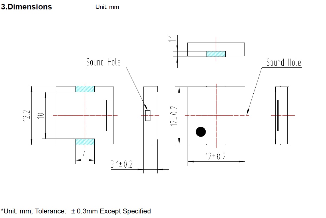Abmessungen 12x12x3mm; Spannung: 1~25V; Eingangsspannung: 3V; Schallpegel: 75 dB; -40~105°C Frequenz 4000 Hz;