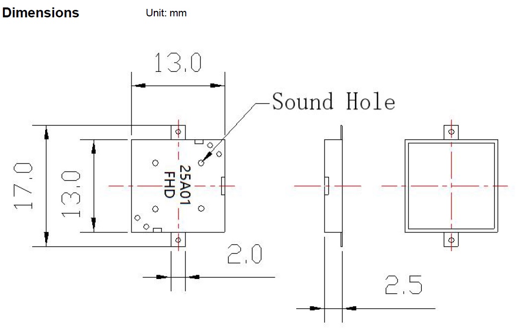 Abmessungen 34,5 x 35 x 36,5 mm; Spannung: 3V; 2,5~6,5V DC; Schallpegel: 75 dB; Leistung: 100 mA; -40~105°C Frequenz 4000 Hz;