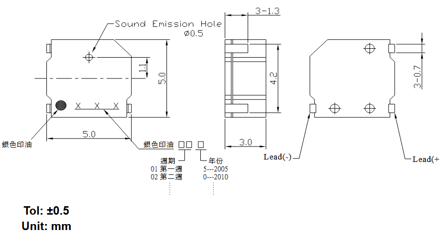 Abmessungen 5 x 5,3 x 2,5 mm Spannung. 3V; Schallpegel: 80 dB; Leistung: 100 mA; Temp. Temperatur: -40-105 °C Frequenz 4000 Hz;