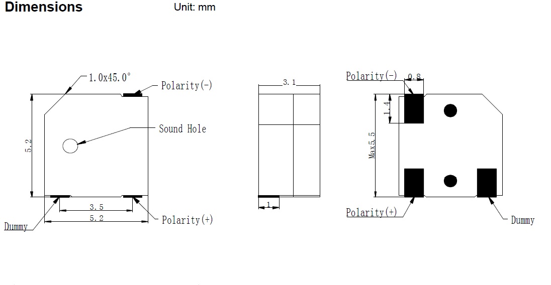 Abmessungen 5,5x5x3mm; Spannung: 3V; 2~5V DC; Strom: 100 mA Schallpegel: 82 dB; -40~105°C Frequenz 4000 Hz;