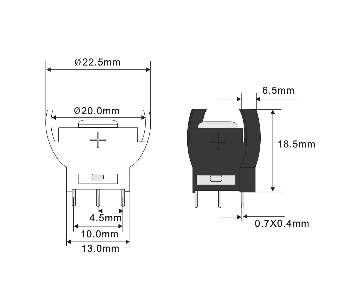 Batteriehalter; BR1216; BR1225; CR1216; CR1225 ; Anzahl der Batterien: 1; Durchmesser: 10,2mm; Länge: 15,3mm; Breite: 9,5mm; Höhe: 3,6mm