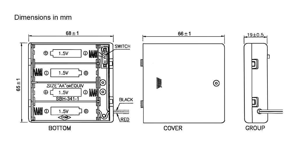 Batteriebehälter; AA; R6; Schwarz; mit Kabeln: 150mm; mit Schalter; Anzahl der Batterien: 4; Länge: 68 mm; Breite: 65 mm; Höhe: 19mm