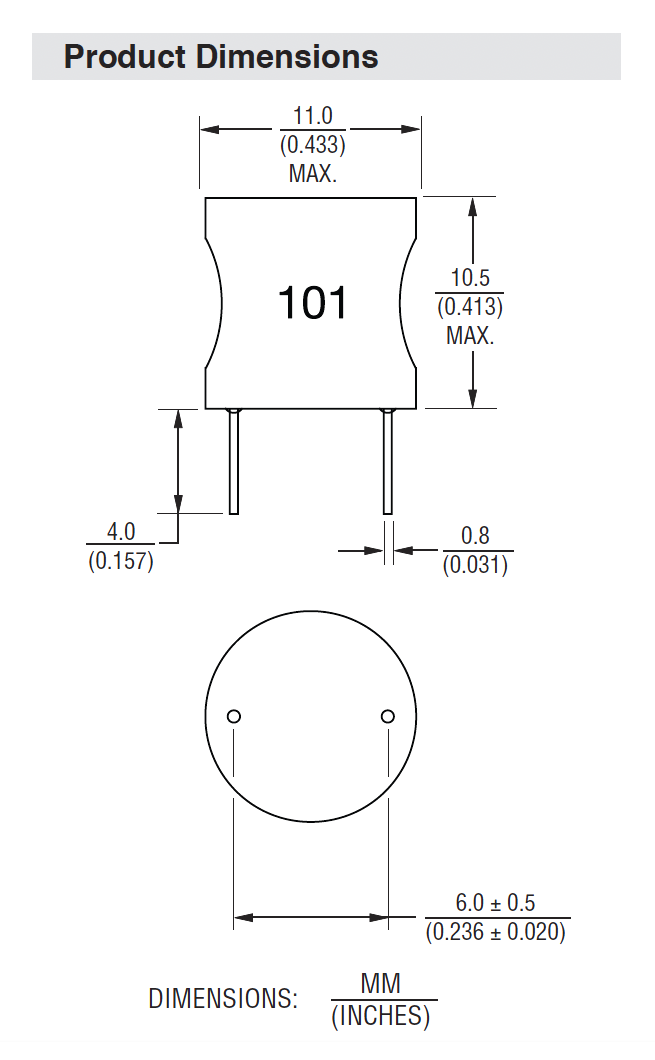 Induktordraht; THT; 1mH; 10 %; 170mA; 3,63R; Vertikale; Maße; 7,2 x 8,5 mm, Betriebstemperatur: -25 °C bis 70 °C