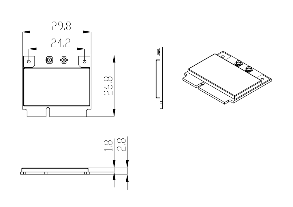 Wi-Fi 802.11ac/abgn + Bluetooth 4.2-Modul, USB, externe Ant. (2x I-PEX-Anschluss) 3,3 V, 2 W, -20-70 °C, Abmessungen 30 x 26,8 x 2,8 mm, Mini-PCIe-Anschluss