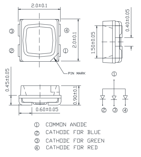 LED SMD 3735 WRGB; Helligkeit: 1900/750/1500/370 mcd; Diodenstrom: 20 mA Wellenlänge: 3000K/622/525/467nm; Abstrahlwinkel: 120°; Spannung: 1,9-3,4V