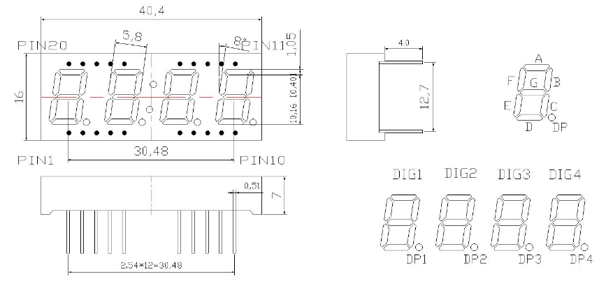LED-Anzeige 0,4" ;Abmessungen: 40,4x16mm; 4-znakowy; czerwony Leuchtdichte: 50-70mcd; Wellenlänge: 620-630m; Betriebsstrom: 20mA; Stromspannung: 1,7-2,4V