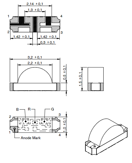 | SMD | RGB | 450/850/140mcd | 622/523/465nm | 20mA | 120° | 2/2,8/3V | -40°C ~ 85°C | 3215 | |||||||||||