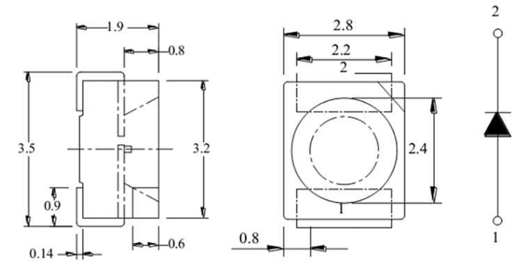 LED 3528 (PLCC2); Weiß; Helligkeit: 2200mcd/8lm; Beleuchtungswinkel: 120°; Diodenstrom: 30mA Farbtemperatur: 6000-7000 K; Betriebsspannung: 2,8-3,6 V