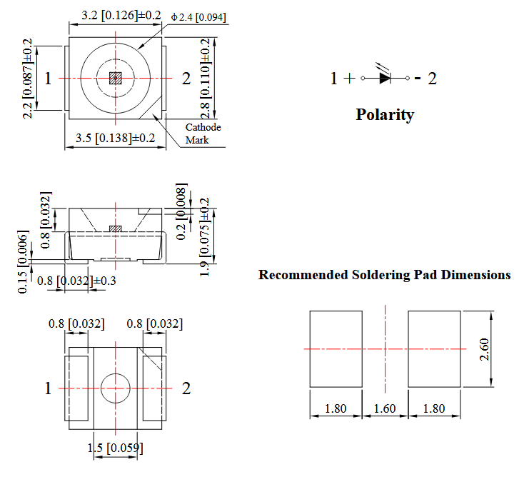 LED 3528 (PLCC2) red; luminosity: 180-560mcd; viewing angle: 120°; led current: 50mA Wavelenght: 626-638nm; operating voltage: 1,7-2,5V