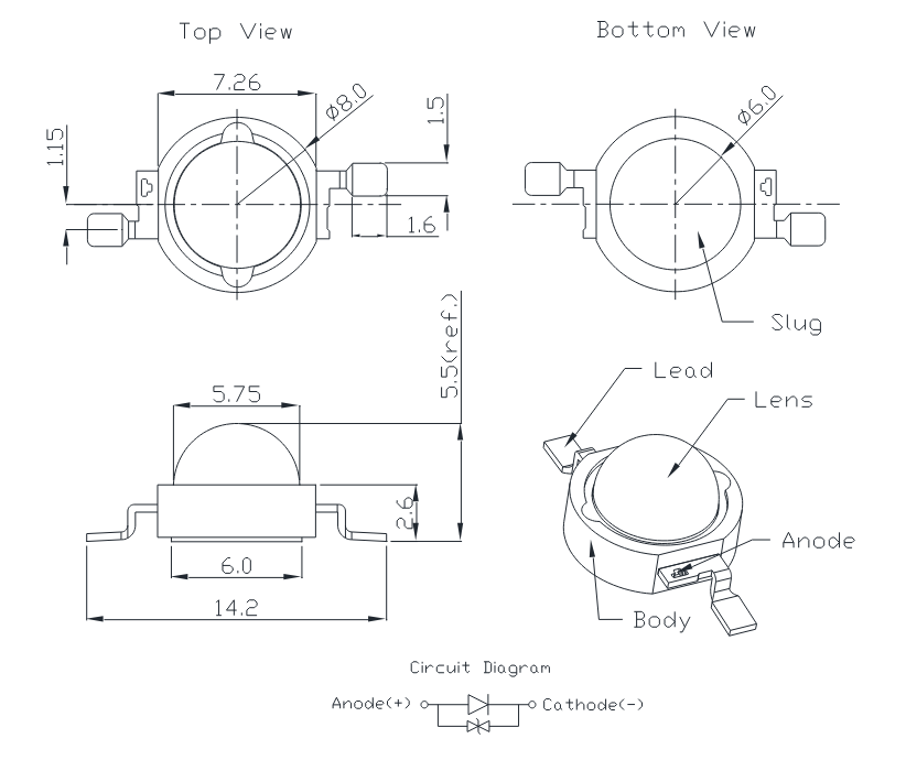 Hochleistungs-LED-3W-Emitter; Weiß; 105~150lm; 700mA; 110°; 3,75 V; 5500 K; viewing angle 110°; IF=700mA; VF=3.75V