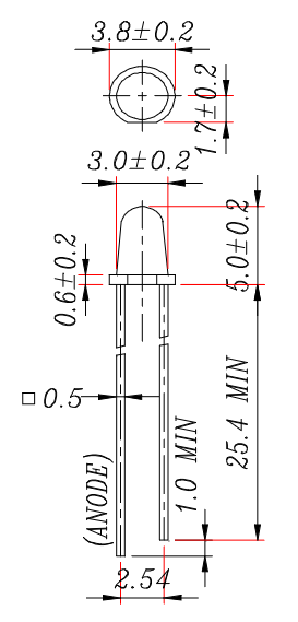 LED THT; diffus; rot; Leuchtkraft: 500 mcd; Abstrahlwinkel: 30°; Diodenstrom: 25 mA Wellenlänge: 624 nm; Leistung: 60 mW; Betriebsspannung: 2 V