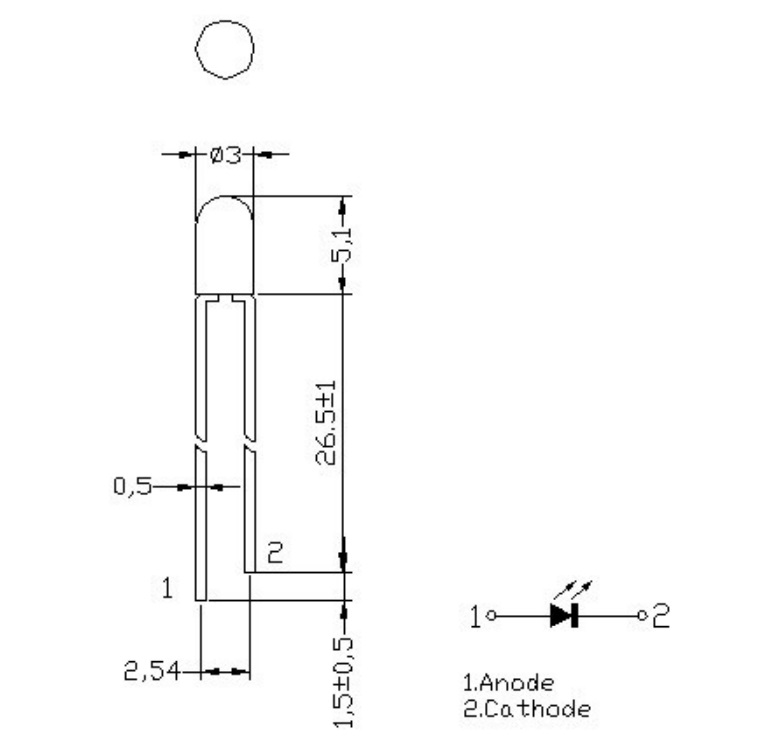 LED-THT; 3mm; Rot; Helligkeit: 12-25 mcd; Beleuchtungswinkel: 60°; Diodenstrom: 30mA Wellenlänge: 617-627 nm; Diffusion; Leistung: 75 mW; Betriebsspannung: 2-2,5V