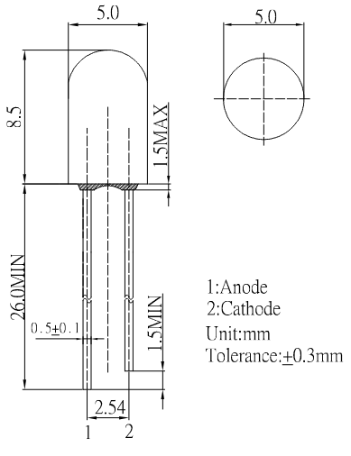 Blau | 470nm | 1120mcd | 1mA | 30° | -30°C ~ 85°C | THT | 5mm | ||||||||||||||||||||||