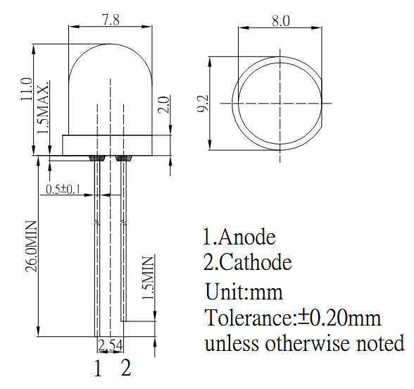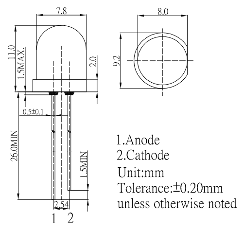 LED; THT; 8mm; Rot; 7000-8400 mcd; 620-630 nm; 20mA; 30°; 1,8 ~ 2,6 V; -30~+85°C Pinbelegungsabstand: 2,54 mm; weiß: diffus