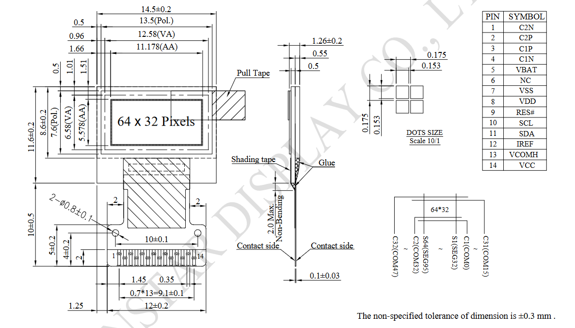 | 14,5x11,6x1,26mm | 14,5x11,6mm | SSD1306 | 64x32 | 1,65V ~ 3,3V | I2C | -40°C ~ 80°C | Weiß | ||||||||||||||||