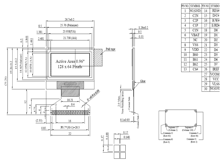 OLED-Grafikdisplay; 96 x 16 Punkte; 0,96 Zoll; weiß; Leuchtkraft: 100–120 cd/m; Kontrast: 2000:1 Abmessungen: 29,1 x 9,2 x 1,3 mm; aktive Fläche: 21,104 x 3,504 mm; Betriebsspannung: 2,8 – 3,3 V; Betriebstemperatur: -40 °C – 80 °C