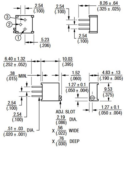 25 Umdrehungen; THT; 3296 W (Bourns) = 64 W (Spectrol/Vishay) = 67 W (BI-Tech) 10x9,5x4,85mm; Leistung: 0,5 W; Toleranz: ±10 %; 100 ppm/°C; Betriebstemperatur: -55 ÷ 125 °C