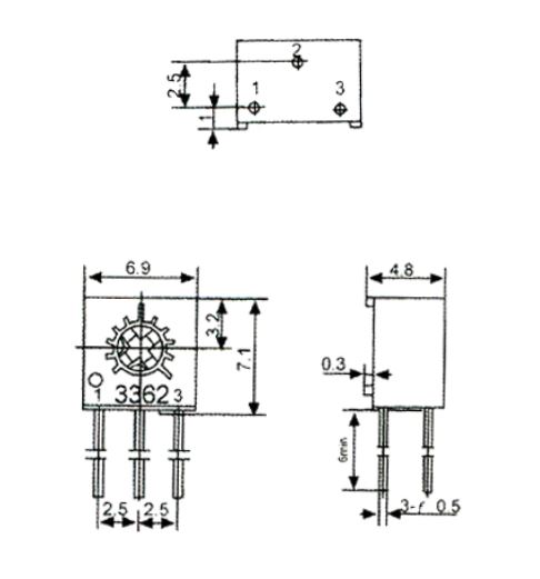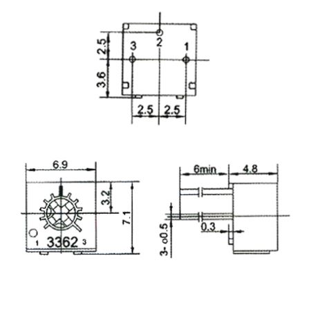 Effektiver elektrischer Hub: 210° ± 10°; THT; 3362X=T73XH=25X; 6,90x7,10x4,8mm; Leistung: 0,5 W; Toleranz: ±10 %; 100 ppm/°C; Betriebstemperatur: -55 ÷ 125 °C