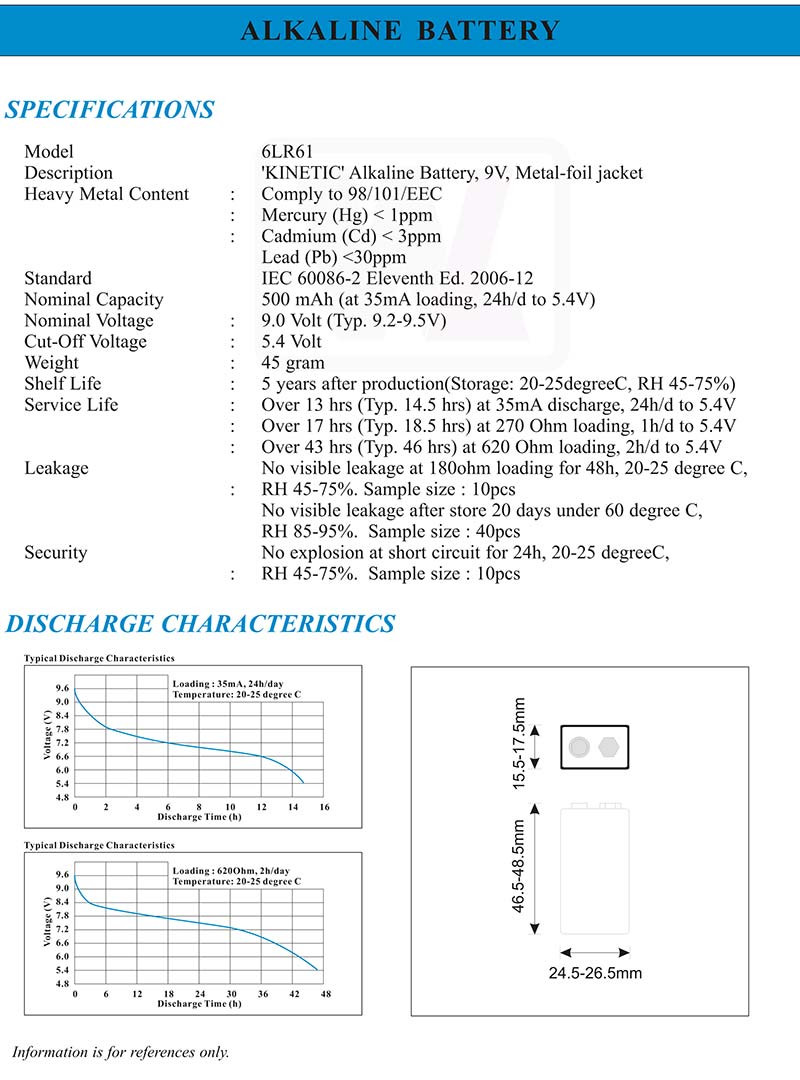 Bateria alkaliczna 6F22 9V 26x48mm Kinetic blister 1 szt. Odpowiednik: 6F22,6LR61,1604A,522-9V,PC1604,K9V,A1604,PP3,6LF22,6LP3146,6AM6,9V