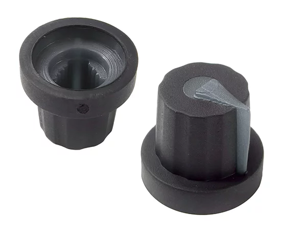 Drehknopf für Potentiometer; Abmessungen: 14,5x16mm; Schaftdurchmesser: 5 mm; Schwarz; Farbzeiger: grau; mit Flansch; Material: Gummi + Kunststoff