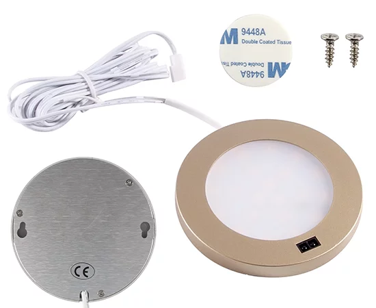 IR-LED-Licht Gold, 3,0 W, warmweiß, 300 lm, 120°, 12 VDC, Abmessungen: d80x8mm 21xSMD2835, Gehäuse: Gold PC, Kabel: 2m