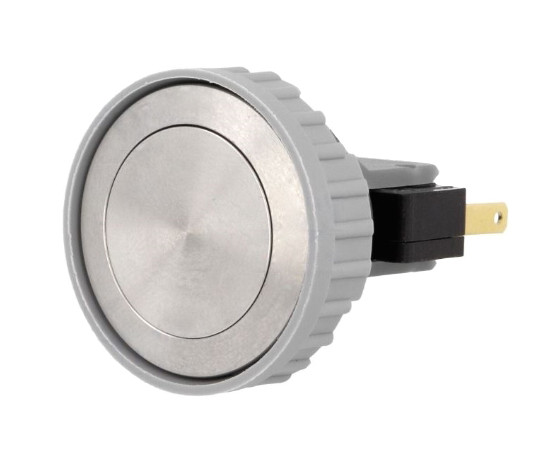 22mm; monostabil; ON-(ON); SPDT; Edelstahl; Silber; zum Löten; flacher Knopf; 3A; 250VAC; IP67; IK07; Lebensdauer: 1.500.000 Zyklen
