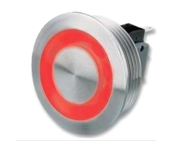 30 mm; monostabil; ON-(ON); SPDT; Edelstahl; Silber; zum Löten; 24V LED-Hintergrundbeleuchtung; Rand; Rot; 3A; 250VAC; IP67; IK07; Lebensdauer: 1.500.000 Zyklen