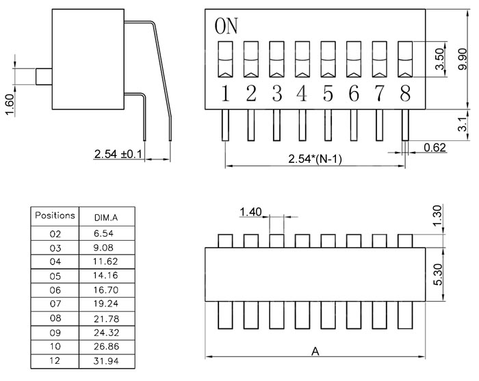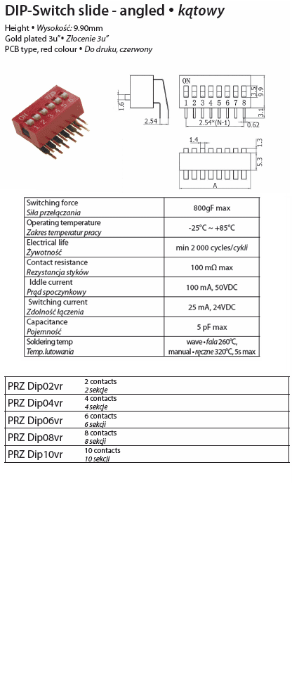 przełącznik dip-switch kątowy, złocenie 1u", wysokość 9.90mm