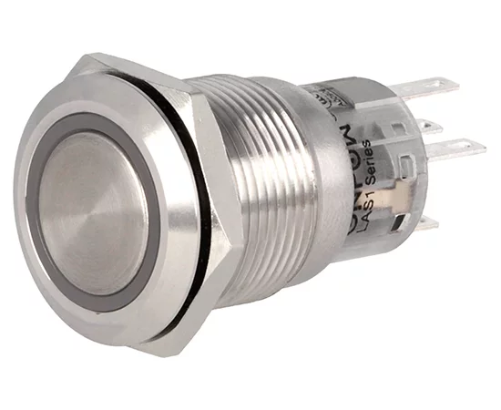 19mm; monostabil; ON-ON; SPDT; edelstahl; silber; lötverbindung; flacher knopf; 1A; 24VDC; IP67; 1000000 zyklen