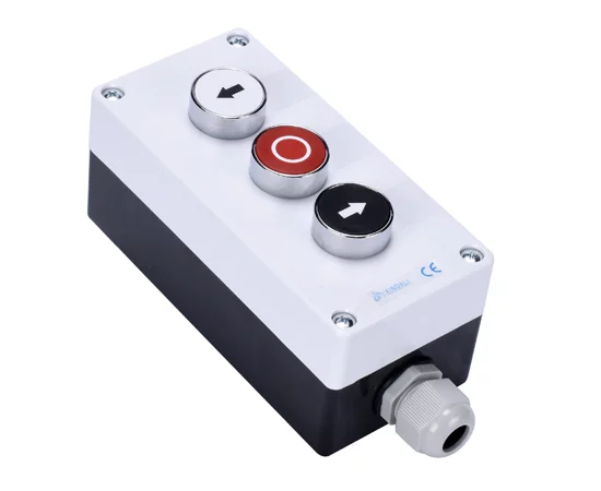 Weiße Schaltfläche (schwarzer Pfeil); +rot (O); + schwarz (weißer Pfeil); drinnen; runden; ohne Hintergrundbeleuchtung; monostabil; im Wohnen; mit Stopfbuchse; N/O+N/C+N/O; IP54; drei Knöpfe; Strom: 10A; Abmessungen: 150x72x65+12mm