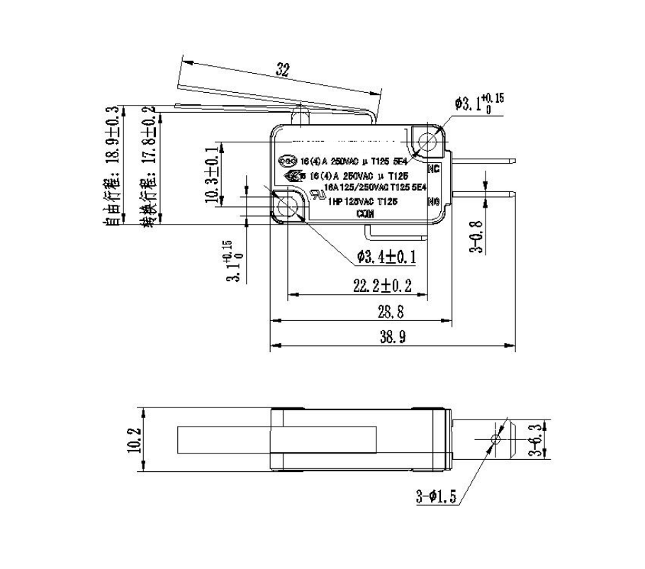 16A 250V; SP-DT; 1NO1NC; 2N; IP40; L=32mm; Lebensdauer: 100000 cycles; Betriebstemperatur: -25°C+125°C