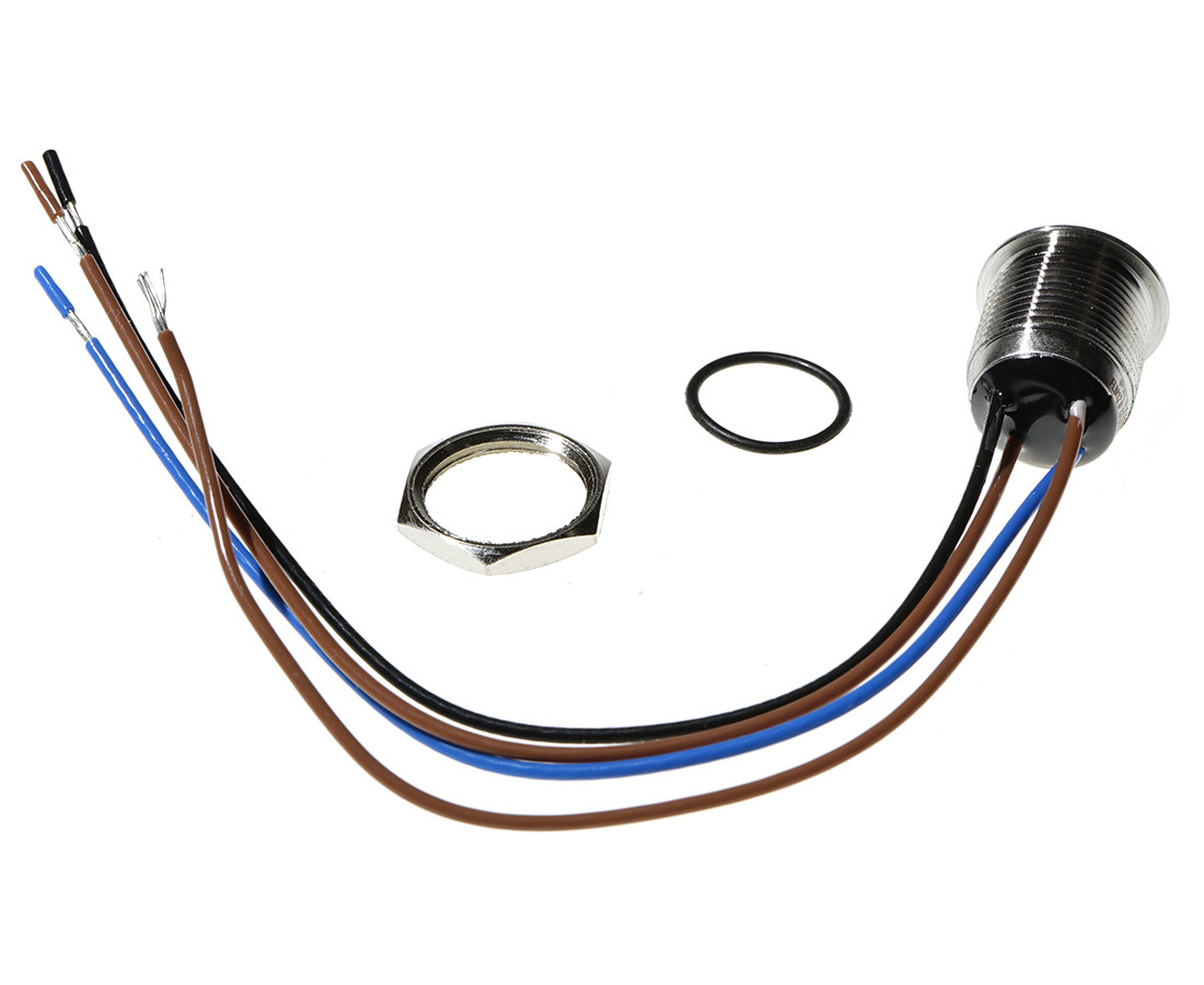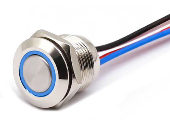 12mm; monostabil; 1NO; Edelstahl; mit Drähten; 22AWG; mit flachem Knopf; LED-Hintergrundbeleuchtung 12V; Rand; Blau; 0,05A; 36VDC; IP67; Lebensdauer: 100.000 Zyklen