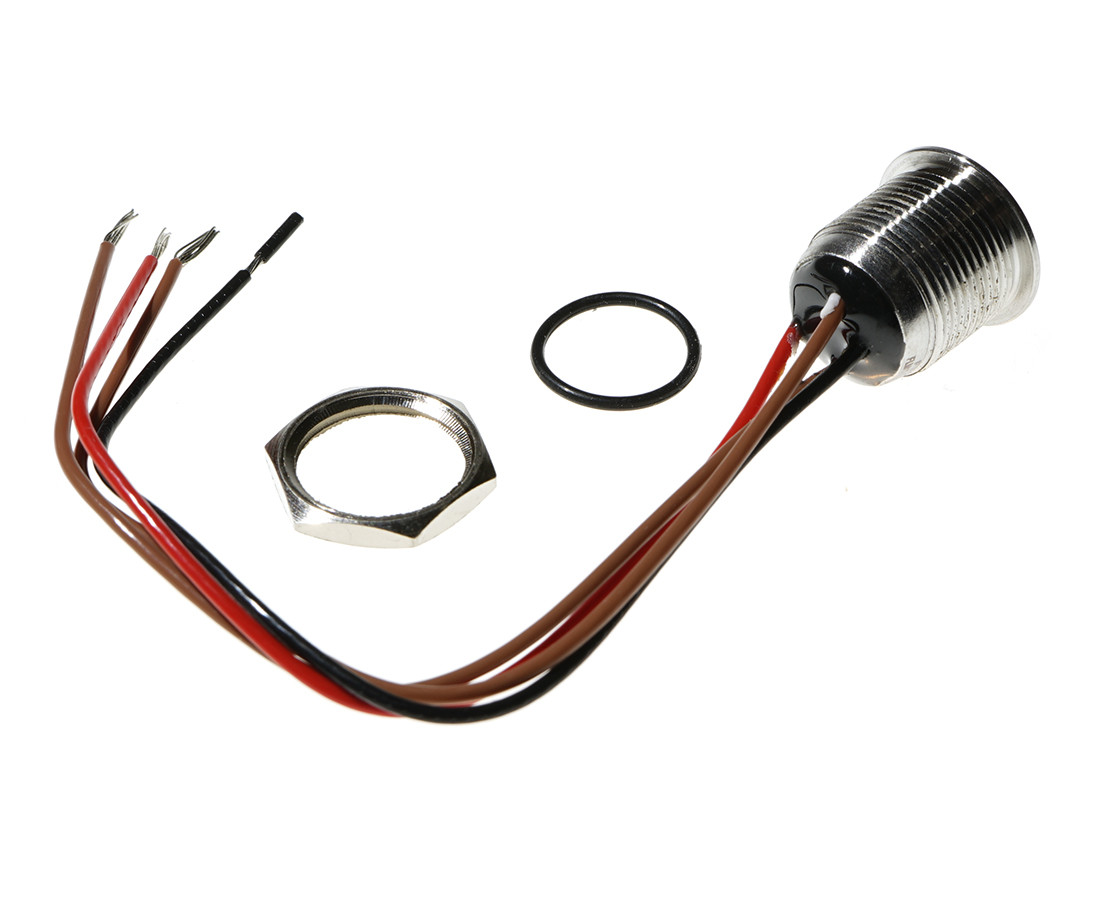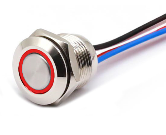12mm; monostabil; 1NO; Edelstahl; mit Drähten; 22AWG; mit flachem Knopf; LED-Hintergrundbeleuchtung 12V; Rand; Rot; 0,05A; 36VDC; IP67; Lebensdauer: 100.000 Zyklen