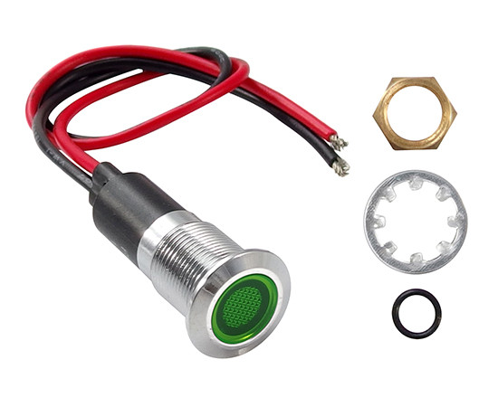 12mm; Wohnung; verchromt; 20 cm lange Kabel; 12V LED-Hintergrundbeleuchtung; Grün; IP65; 20mA; Lebensdauer: 80.000 Stunden