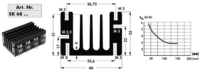 Kühlkörper, SK68; auf TO220; Länge = 100,0 mm; Breite = 46 mm; Höhe=33mm