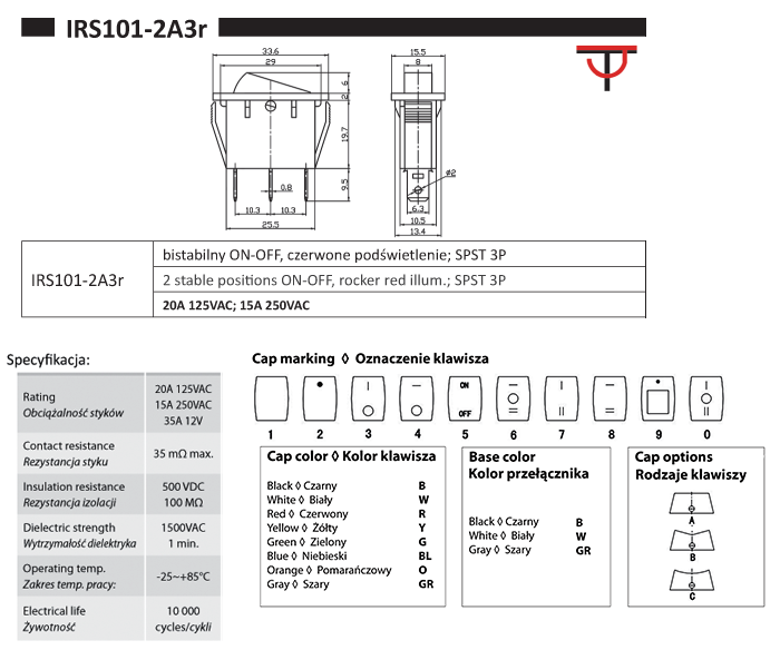 bistabil; EIN-AUS; rote Hintergrundbeleuchtung; Körper: Schwarz; SPST; 3P; 10A 125V; 6A 250V; Lebensdauer: 10000 Zyklen; Betriebstemperatur: -25°C+85°C