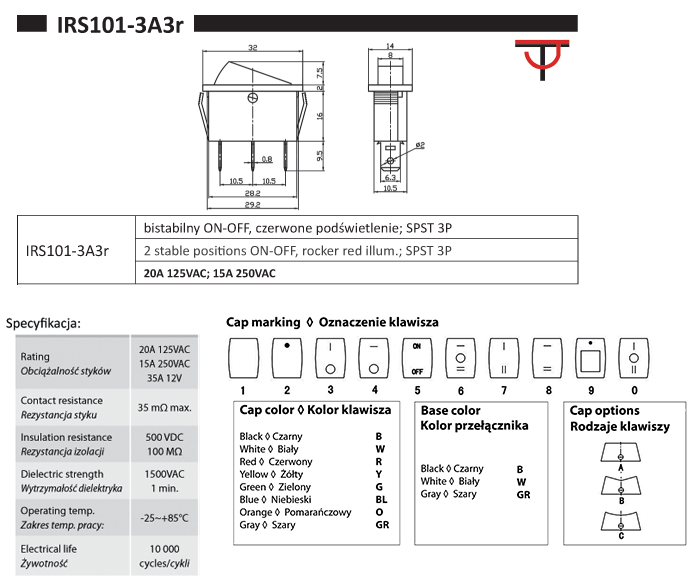bistabil; EIN-AUS; rote LED-Hintergrundbeleuchtung; 230V; Körper: Schwarz; SPST; 3P; 10A 125VAC; 6A 250VAC; Lebensdauer: 10000 Zyklen; Betriebstemperatur: -25°C+85°C