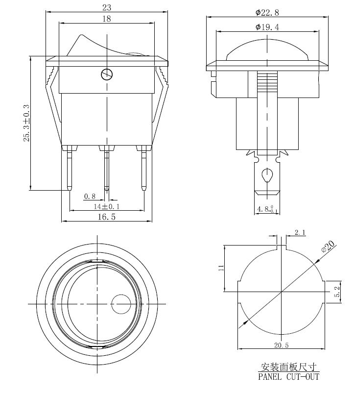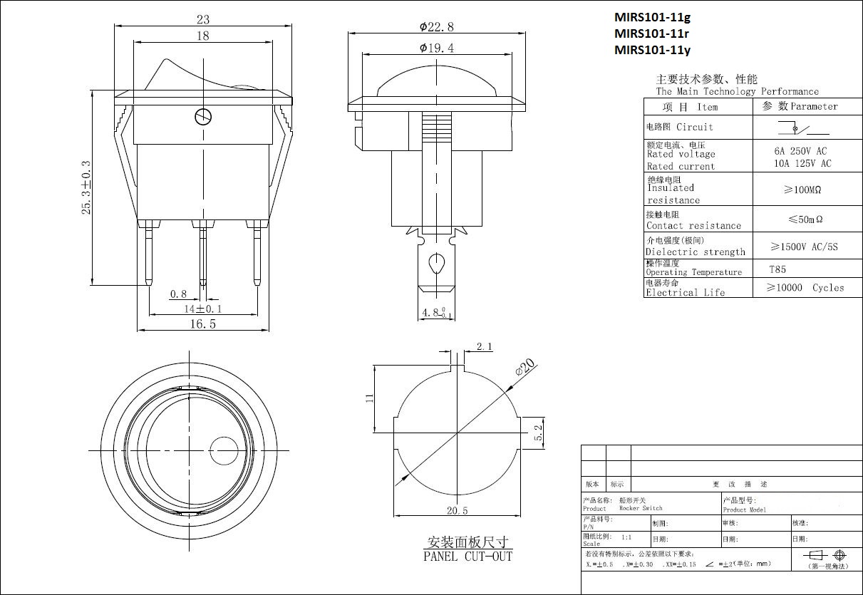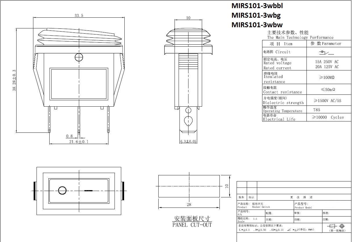 bistabil; EIN-AUS; blaue Hintergrundbeleuchtung; Körper: Schwarz; SPST; 3P; 20A 125V; 15A 250V; Lebensdauer: 10000 Zyklen; Betriebstemperatur: -25°C+85°C