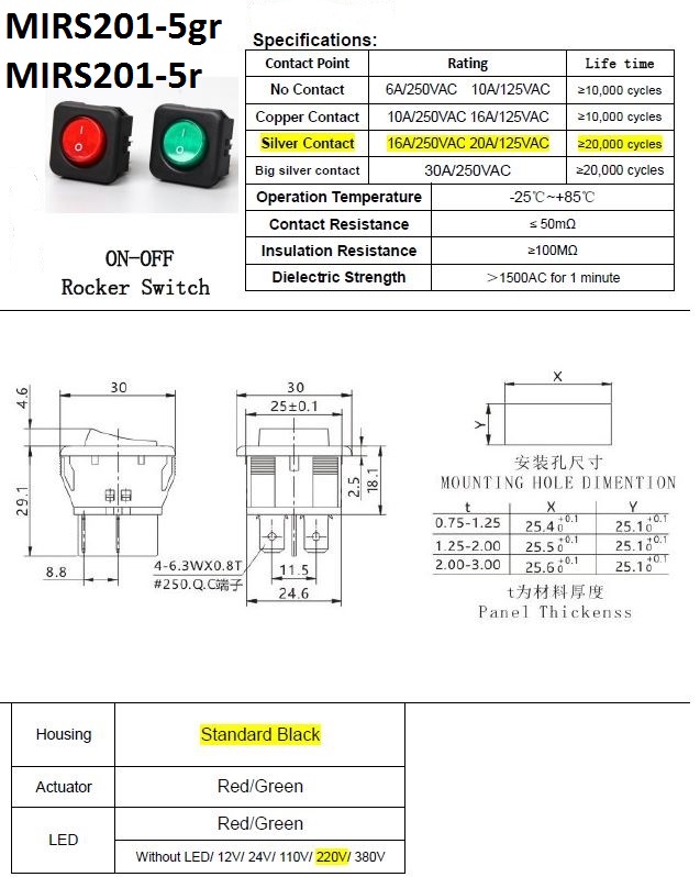 bistabil; EIN-AUS; grüne Hintergrundbeleuchtung; Körper: Schwarz; SPST; 2P; 16A 250VAC; 20A 125V; Lebensdauer: 20.000 Zyklen; Betriebstemperatur: -20°C+85°C