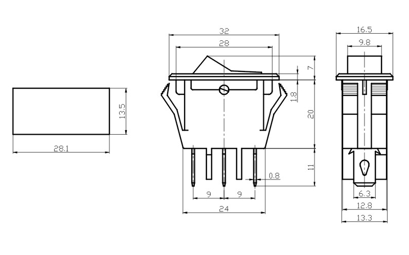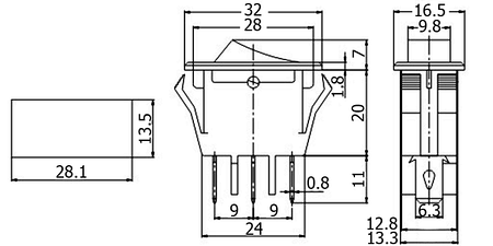 bistabil; EIN-AUS; rote Hintergrundbeleuchtung; Körper: Schwarz; SPST; 3P; 13A 125V; 6,5A 250V; Lebensdauer: 10000 Zyklen; Betriebstemperatur: -25°C+85°C