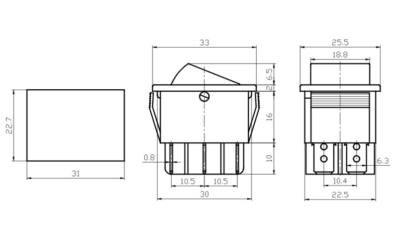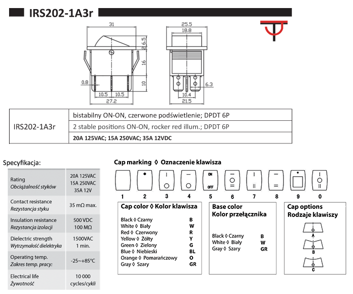 bistabil; EIN-AUS; rote Hintergrundbeleuchtung; Körper: Schwarz; SPST; 3P; 20A 125V; 15A 250V; Lebensdauer: 10000 Zyklen; Betriebstemperatur: -35°C+85°C
