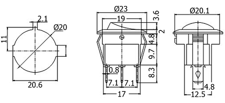 bistabil; EIN-AUS; rote Hintergrundbeleuchtung; Körper: Schwarz; SPST; 3P; 20A 125V; 15A 250V; Lebensdauer: 10000 Zyklen; Betriebstemperatur: -25°C+85°C