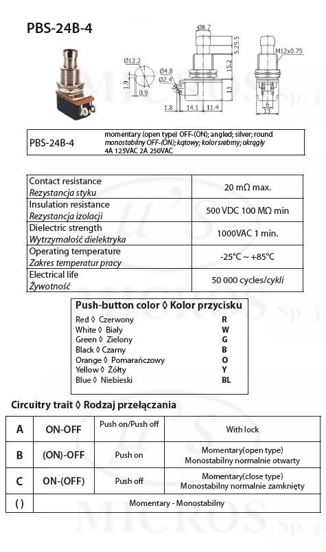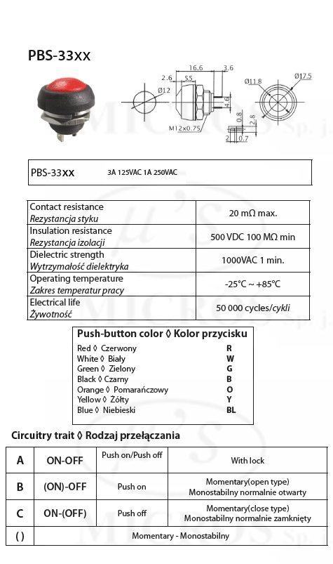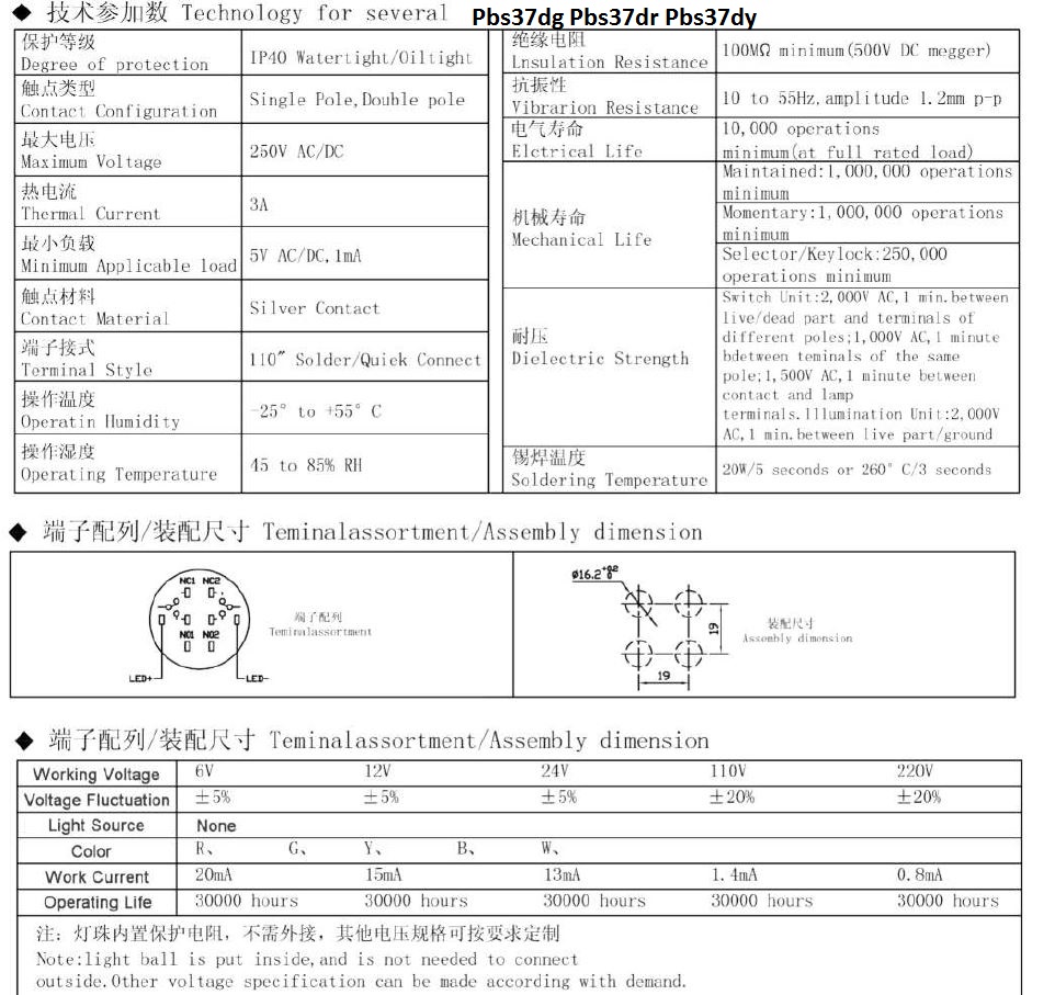 monostabil; Kunststoffkörper; AUS-(EIN); normalerweise offen = normalerweise offen; Farbe rot; runden; 3A 125VAC 1A 250VAC; Lebensdauer: 50.000 Zyklen; Äquivalent: PS10BRD