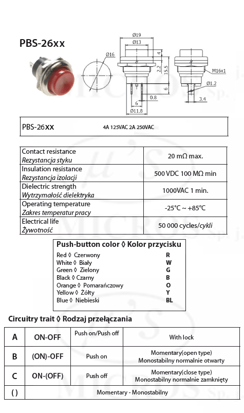 monostabil; Kunststoffkörper; AUS-(EIN); normalerweise offen = normalerweise offen; Farbe grün; runden; 3A 125VAC 1A 250VAC; Lebensdauer: 50.000 Zyklen; Äquivalent: PS10BGN