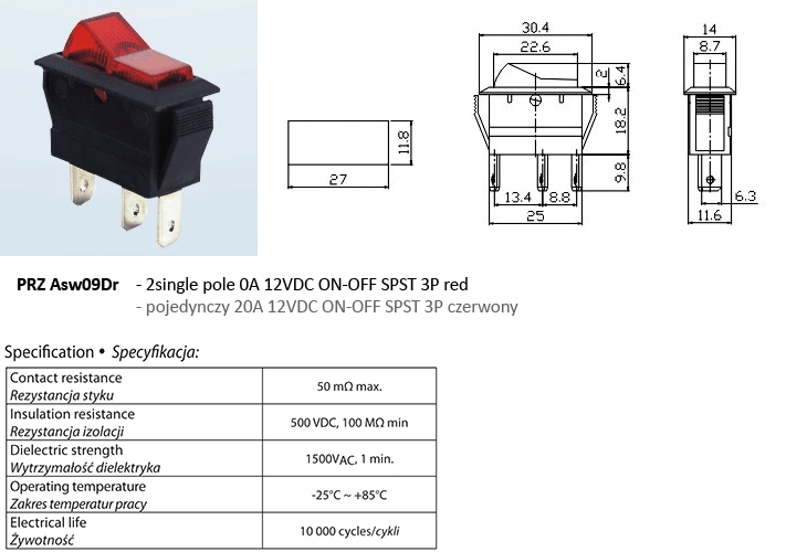 10A; 12 VDC; EIN-AUS; einzel; SPST; 3P; rote Hintergrundbeleuchtung; Lebensdauer: 10000 Zyklen; Betriebstemperatur: -25°C+85°C