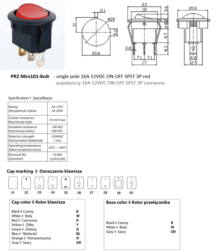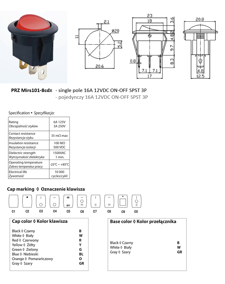 10A; 12 VDC; EIN-AUS; einzel; SPST; 3P; weiße Hintergrundbeleuchtung; Lebensdauer: 10000 Zyklen; Betriebstemperatur: -25°C+85°C