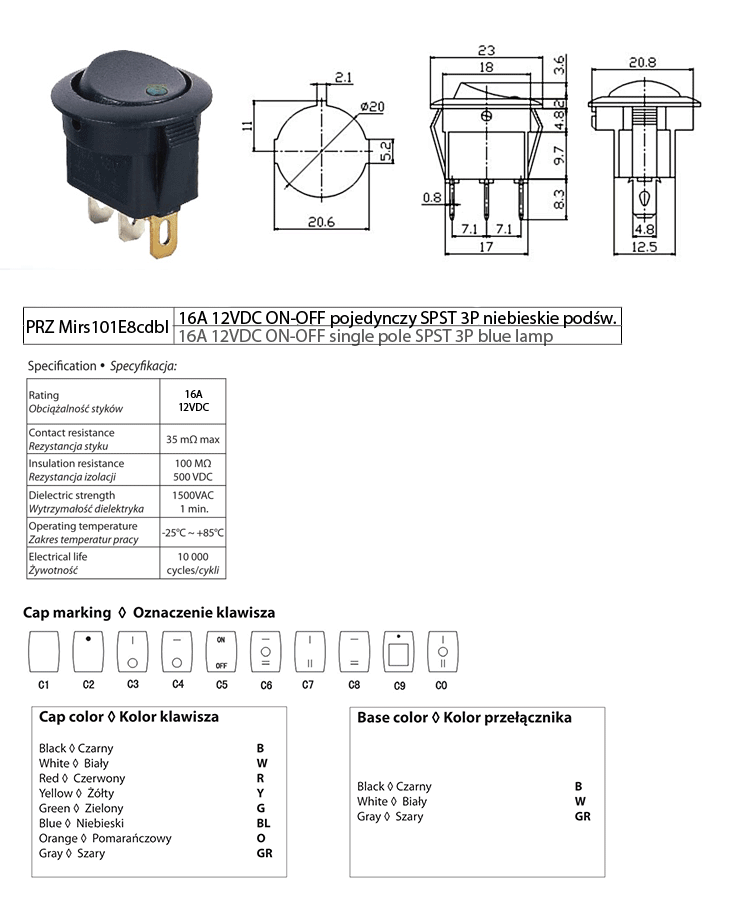 10A; 12 VDC; EIN-AUS; einzel; SPST; 3P; blaue Hintergrundbeleuchtung; Lebensdauer: 10000 Zyklen; Betriebstemperatur: -25°C+85°C