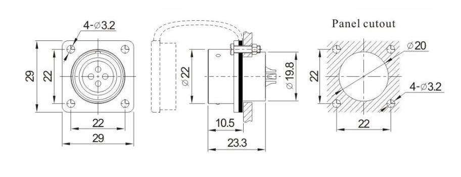 Buchsenstecker, rund, 3-polig quadratischer Flansch, für Schalttafelmontage, IP67, 500 V, 10 A, passend für SF1610